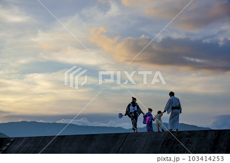 夕暮れの防波堤で遊ぶ浴衣姿の4人家族