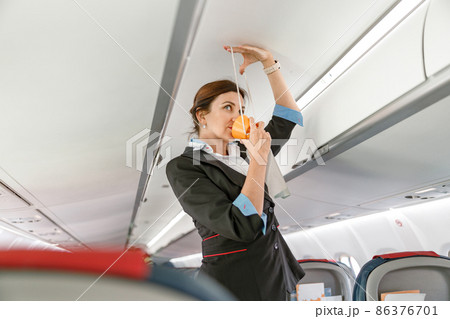 Stewardess in airplane cabin interior