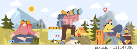 Vector illustration of people enjoying outdoor activities. One person meditates, another uses binoculars, and the third relaxes by a tent. Mountains and trees create a scenic backdrop.