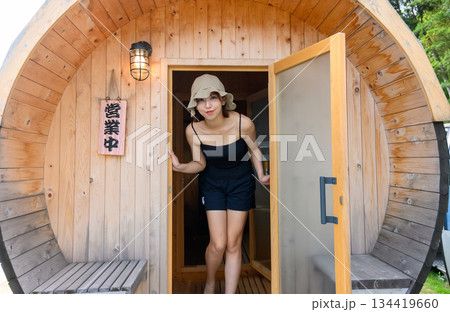バレルサウナの入口から出てくる女性
