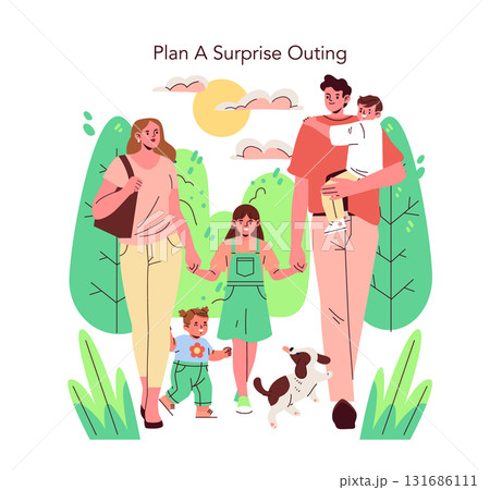 Family enjoying a surprise outing in a scenic location, featuring happy parents and children walking together with a dog. Bright and cheerful vector illustration captures joy and playfulness.