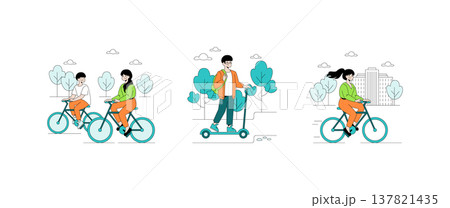 Vector illustration of a group enjoying cycling and scooter riding in an urban park setting. Depicts joyful interactions and movement among trees, capturing a lively, active lifestyle.