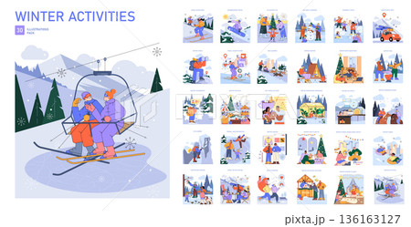 Winter activities vector pack showcasing a ski lift ride among snowy mountains. Features couples enjoying winter sports, snowboarding, skiing, and mountain exploring with festive charm.