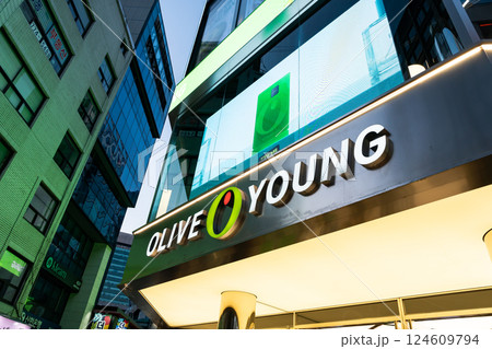 オリーブヤング フラッグシップストアの入口 明洞 春の青空 韓国ソウル