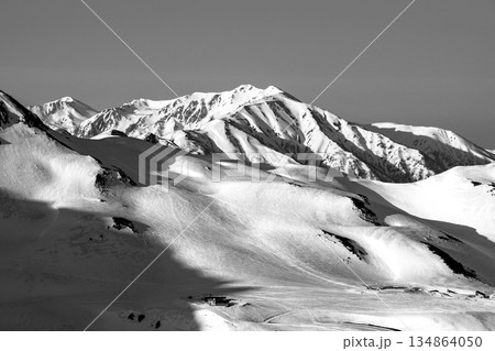 別山乗越から見るモルゲンロートの薬師岳と室堂平 残雪期の北アルプス立山・別山登山 新聞広告用