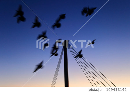 早朝に空を旋回する鳩