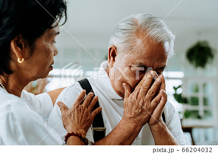 Unhappy retired Asian senior couple sitting on the sofa while elderly wife comforting her sad husband at home.