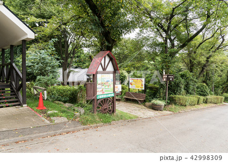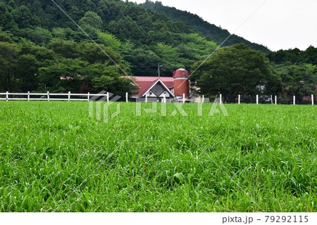 愛川町 服部牧場の牧草地と観光施設と新緑