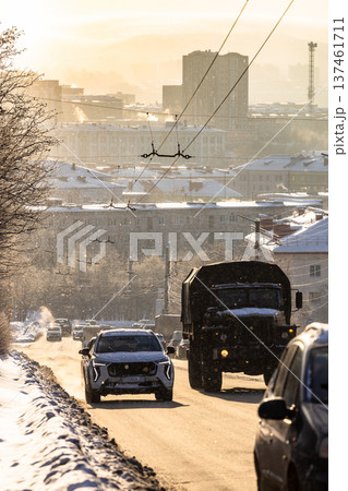 cars on road in Murmansk city on sunny winter day