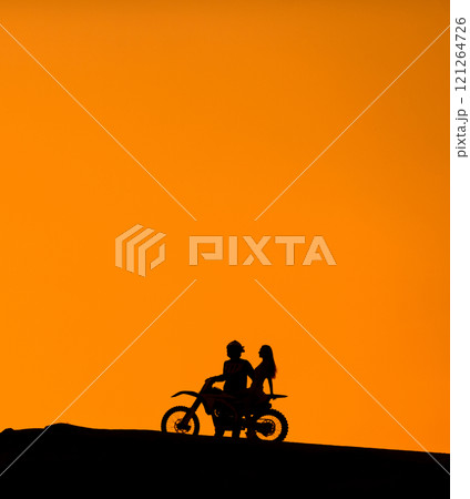 Silhouette of a girl and a man on a motorcycle.