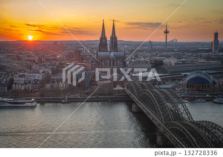 A breathtaking view of the Cologne skyline during sunset featuring the iconic Cologne Cathedral and the city's famous bridge. The warm hues of the evening sky create a stunning scene in Germany.