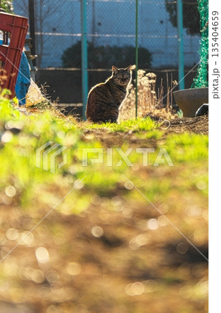 畑の隅で日なたぼっこに微睡む野良猫