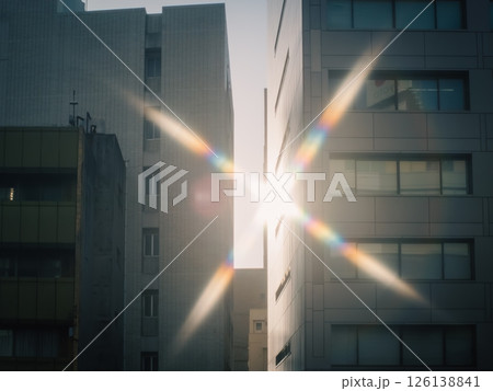 ビルの隙間から太陽光がまぶしく差し込む様子 ビジネス