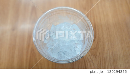 Top View of Ice Cubes in a Transparent Plastic Cup on Wooden Surface