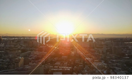 川越から見る初日の出とさいたま新都心・東京の高層ビルの眺め 埼玉県川越市(ドローンによる空撮)