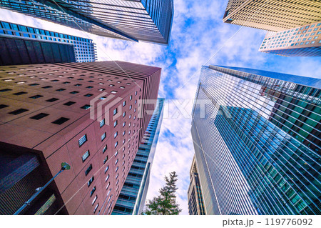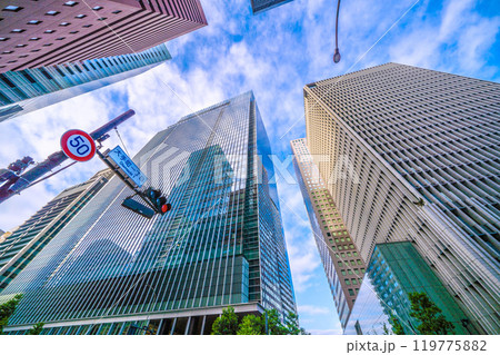 日本の東京都市景観 10月。早朝の大手町。KDDI大手町ビルや大手町ワンなどを望む=27日