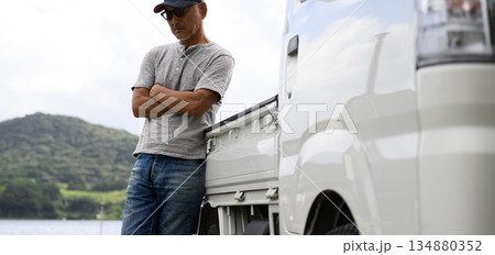 軽トラックの横で立つ男性 【撮影協力:隠岐シーサイドリゾートみやび様】