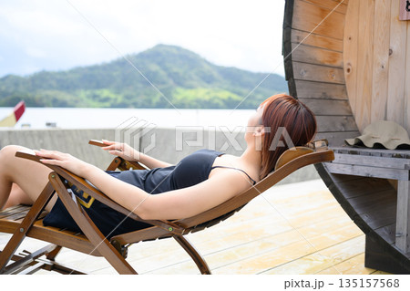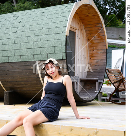 女性が樽型サウナ小屋で休憩 【撮影協力:隠岐シーサイドリゾートみやび様】