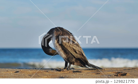 Great cormorant preening feathers on Crimean beach with blue sea in background