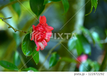 椿の林に赤い花が咲いています。和風の趣の背景にどうぞ。萩市-3