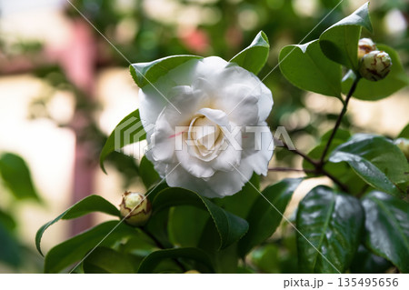 White camellia japonica blooming on evergreen shrub with glossy dark green leaves in garden light. Elegant ornamental flower growing outdoors in nature.