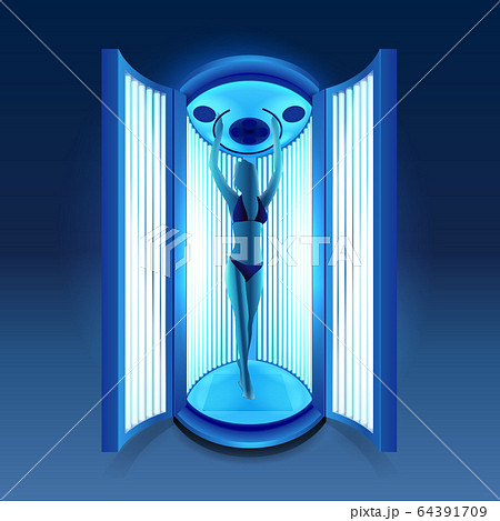 silhouette of slim girl sunbathing in solarium cabin with blue luminous tanning lamps in bikini