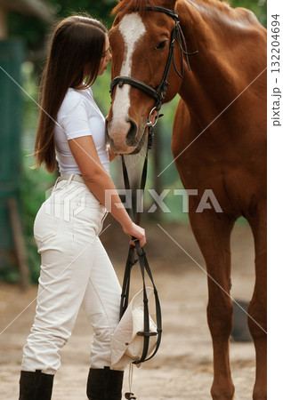 Tranquil scene, standing. Beautiful young woman is with horse indoors