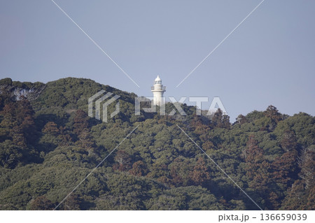 対岸から見た岬の風景 小さく白い灯台が見える