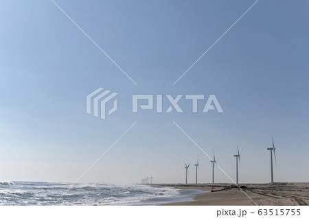 茨城県日川浜海岸から風力発電の風車が見える風景