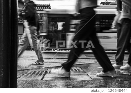 雨の街を歩く人々と走り去るバス(モノクロ)