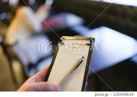 クリップボードで注文を取る手元