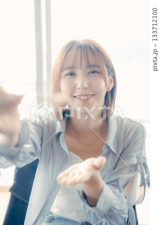 食事をシェアする20代女性の微笑みシーン