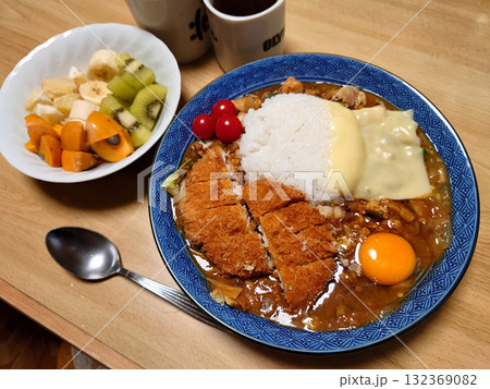 洋食屋さんで食べる手作りカレー(メンチカツ,生卵,チーズのトッピング),デザートボウル付き
