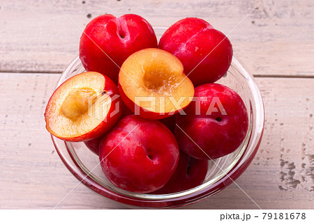 甘酸っぱくて美味しい スモモ( 早生 )明るい木目背景