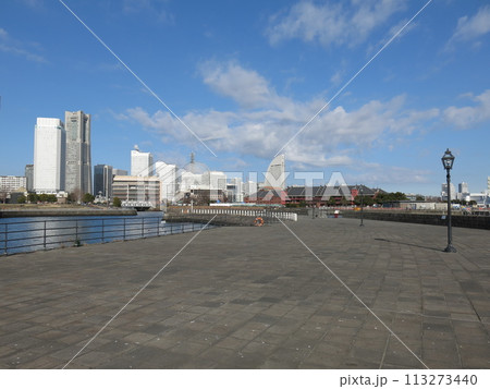横浜港の象の鼻防波堤(背景に横浜ランドマークタワー・大観覧車・横浜赤レンガ倉庫など)