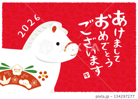 2026年午年の年賀状テンプレート。白馬、かわいい、縁起物、ベクター、梅の花