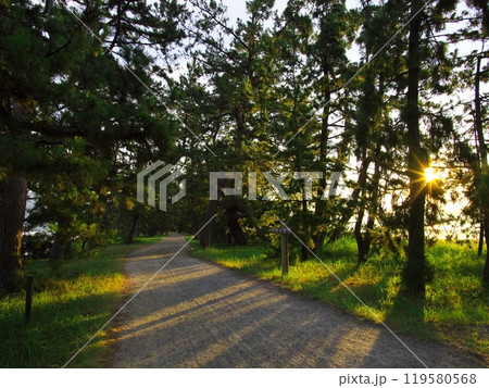 夏の天橋立 松林と朝日の木漏れ日に囲まれた道