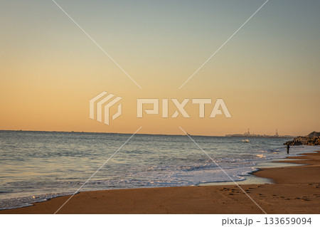 朝日に染まる河原子海岸の砂浜と穏やかな波(茨城県日立市)