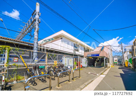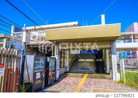 日本の横浜都市景観 8月。SOTETSU 西谷駅 南口などを望む。出入口わきにあるのは宅配便ロッカー