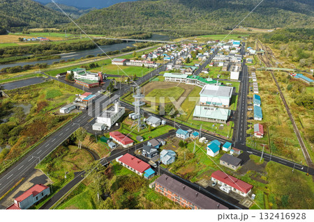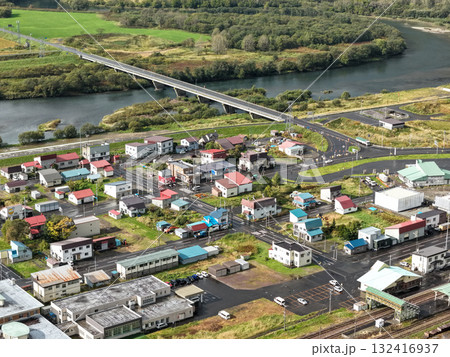 北海道・音威子府村の中心部と川沿いの町並みを上空から撮影した空撮写真