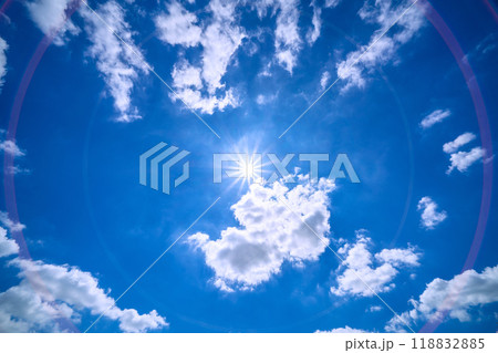 日本の雲風景 青空と飛行機雲(画面右は太陽のある方向)