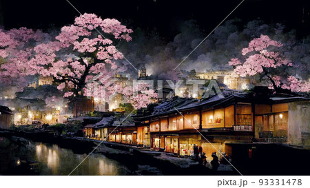古い京都のような街並みの夜景 満開の桜 ファンタジーの世界「AI生成画像」