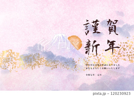 富士山と初日の出のめでたい風景水彩画と謹賀新年のハンコの年賀状用背景素材