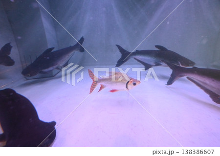 アクアリウムを彩るシルバーシャークと大型熱帯魚の混泳
