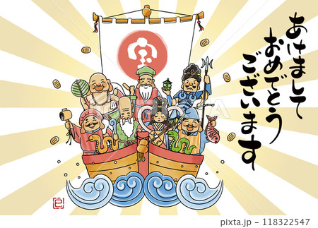 宝船と七福神の年賀状デザイン 縦型横書き
