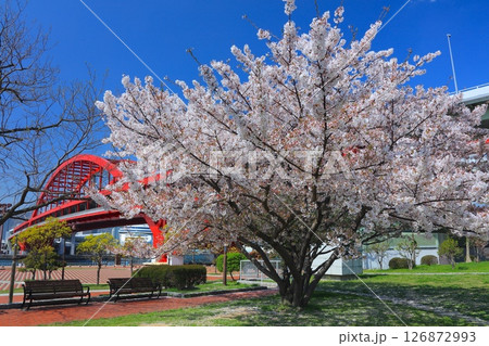 神戸ポートアイランド北公園の桜と神戸大橋/兵庫県神戸市/神戸港/日本三大旅客港