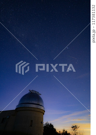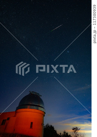 夜明け前の天文台と流星