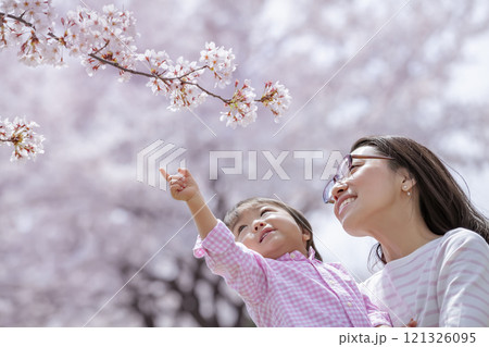 桜の咲く公園で遊ぶ母と子