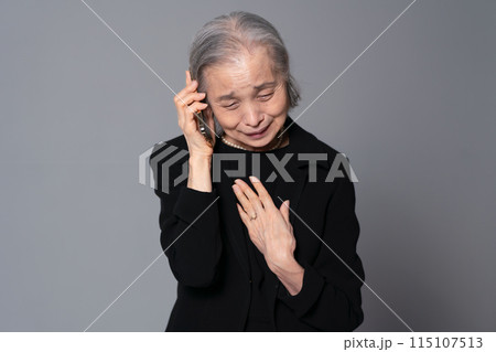 喪服のシニア女性 スマホ 通話