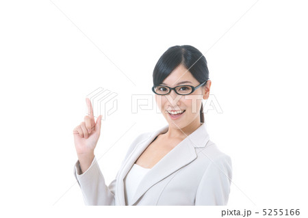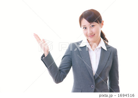 笑顔でポイントを示す若い日本人女性